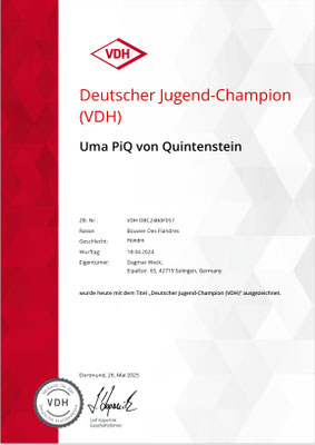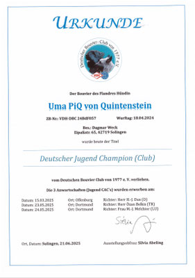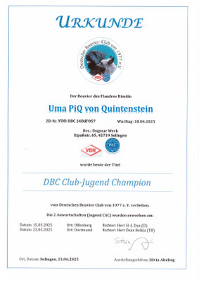 Uma PiQ von Quintenstein, Jugendklasse: V1, Anw.Dt.J-CH VDH, FCI-CACIB-J., Klub-J-CAC, Jugendsieger Dortmund